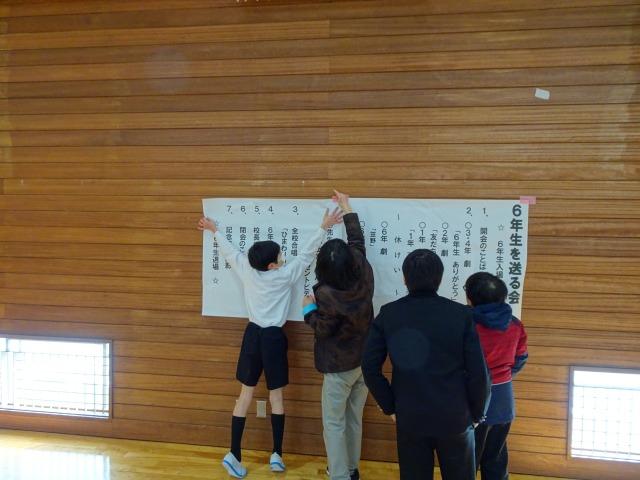 午後から4,5年生で送る会の会場準備をしました。真剣に先生の指示を聞いていました。てきぱきと動いていたので早く準備が整いました。さすが4,5年生です。本番も楽しみです。