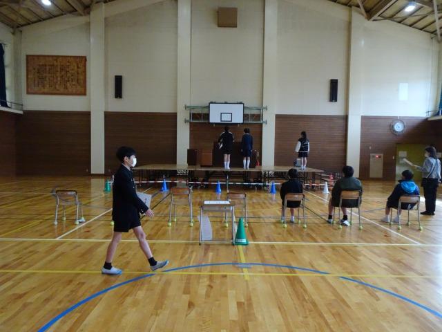 来週の卒業式に向けて,体育館にステージを設置し,今週から卒業式練習が始まっています。7名の6年生が動きを確認していました。明日から全校練習も始まります。