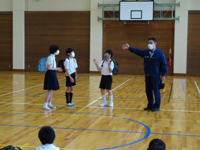 津幡警察署の方をお招きし,不審者対応訓練を行いました。不審者にできるだけ刺激を与えず,自分(職員)の身を守りながら,子どもがいる場所に近づけないように,落ち着いて対応しなければなりません。児童は,職員の指示により,迅速に静かに避難する必要があります。津幡署の方からは,児童・職員の対応に高い評価をいただきました。