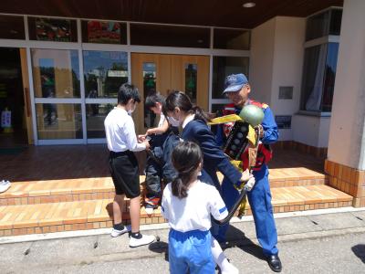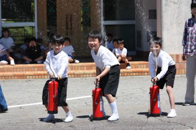 今年度初めて,火災による避難訓練をしました。「お」おさない,「か」かけない,「し」しゃべらない,「も」もどらないの約束を練習しました。どの子も真剣に訓練できました。津幡町消防本部の方に「すぐに逃げることが大事,けむりが危険」と教えていただきました。その後,全員が消火器を使う体験をしたり,消防服を着せてもらったりしました。