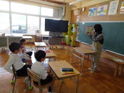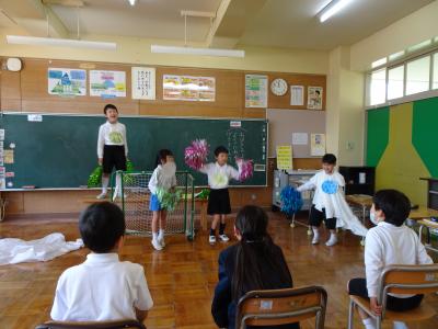 2年生が国語科「ふきのとう」を学習しました。その学習の成果として1年生に劇を発表しました。2年生は,せりふを覚えて,登場人物になりきり大きな声と動作で表現していました。とても上手でした。劇の後には,2年生は図書館司書の先生から「春」の絵本を読み聞かせをしてもらいました。