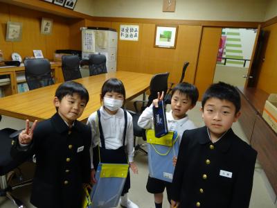 1年生4人が,生活科の学習で学校探検をしています。校長室にも探検にやってきました。校長室にある大きな机や歴代校長写真,校舎の写真など発見していました。