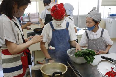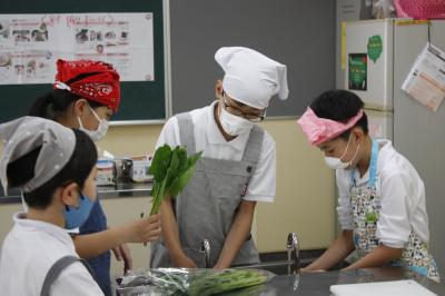 5・6年生が家庭科の学習で調理実習を行いました。5年生は青菜やじゃがいもを茹でて切って「ほうれんそうのおひたしとゆでいも」を,6年生はにんじんやたまねぎ,ハムを切って炒めて「いろどりいため」を作りました。おいしくいただきました。後かたづけも最後までがんばりました。