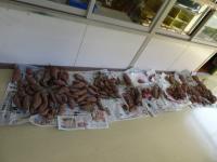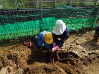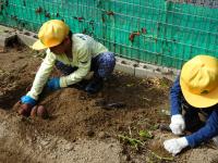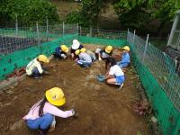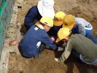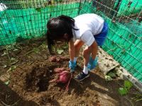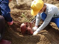 学校の畑のさつまいもを収穫しました。今年も獣よけ柵の効果もあり畑を荒らされることなく,とても大きなりっぱなさつまいもが実りました。子供たちは,「うんとこしょ・どっこいしょ」とつるをひっぱたり,土を深く掘ったりと協力していました。「あった!!」や「とれた!!」,「おっきい」などの楽しい声が聞こえてきました。畑をお世話してくださった畑の先生ありがとうございました。