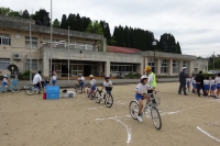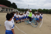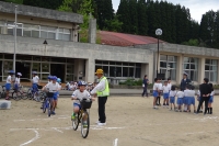 心配していたお天気ですが,何とか持ちこたえました.保護者の皆様におかれましては自転車の運搬ありがとうございました.運動場に道や横断歩道を作り,実際の安全な乗り方や歩き方について警察署や町役場の皆様からご指導いただきました.「ぶたはしゃべる」ブレーキ,タイヤ,反射材,車体(サドル),ベル等自転車の安全点検が大切なことも教えていただきました.この地域は坂が多いのでスピードの出しすぎには十分注意してください.最後はDVDを見て,安全教室の振り返りができました.