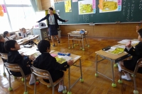 ↓1年生活科 自分が育てる苗となかよくなるお話をしています.先生のモデルを見て,お話記録カードを書きました.