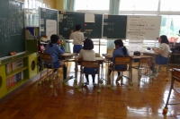 ↓ 5.6年複式学級で町複式教育部会を実施し,刈安小学校の先生方と合同研修会をしました.複式学級では,1つの教室で1人の教員が2学年の授業を進めます.5年は内のり,容積の求め方を学習し,6年生はかける数に着目し積の大きさの見当が付くわけを話し合いました.授業の中盤には,あれ?本当かな?どうするかな?等思考を深める場面を作ることを本校の共通実践としています.