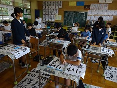 ↓ 5,6年生の毛筆です。6年生の文字は「ゆずり葉」でした。仮名と漢字のバランスを考えて書きました。6年生の学校のリーダーとしての仕事は、徐々に5年生にゆずられ、5年生のサポート役になっていきます。卒業までの残された日々、笠野小全ての児童の素晴らしいお手本として歩み続けてください。