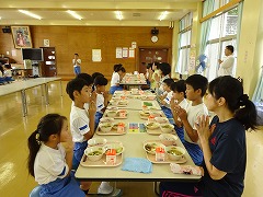 ↓ 今日から萩野台共同調理場からの配送による給食がスタートしました.給食の配膳の方法を子供たちと確認し,おいしく給食をいただくことが出来ました.