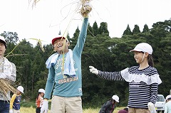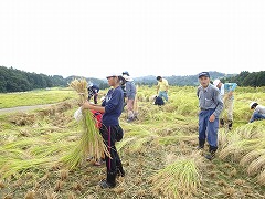 ↑ 稲刈りの時の稲のかぶの持ち方は親指を上に向けること,刈った稲をわらで稲をくっるっと回して束ねること,はさにさっと掛けるために刈った稲を交差しておくこと,そして,はさの掛け方等たくさん教わりました。作業の一つ一つが効率よく進める熟練の技から出来上がったもので,農家の皆さんの知恵の素晴らしさを肌で感じることができました。なんと言っても,はさに掛けた「稲のにおい」は「秋のにおい」で,黄金の秋を五感いっぱいに味わわせて頂きました。市谷ブランド米は,高台のきれいな水と緑いっぱいの美味しい空気で育っていますので,味は格別においしいのです。その作業にほんの少しですが,携われたことを誇りに思います。6年生の稲刈り体験はこれで最後となりました。潤いのある豊かな体験をきっとこれからの人生に生かしていくことでしょう。