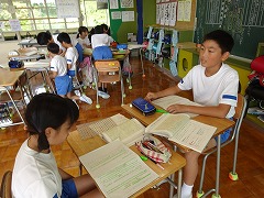 ↓ 給食の後、昨日と本日の2日間にわたり、全校児童で全校児童の自学を見合う会を行いました。自学への意欲の向上と内容の充実をねらっています。自学はどの子も工夫をして一生懸命頑張っていることが全校のみんなにも伝わったことでしょう。学校の勉強の予習、復習を教科書を使ってどんどん進めてください。また、自分でさらに調べたくなったことを追求することも素敵ですね。日記を書いたり、新聞記事を読んだ感想などもためになりますね。