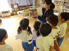 ↓ 1年 国語 かくれんぼシリーズの本を学校司書に読み聞かせをして頂きました。教科書の教材文から発展し,自分が選んだお気に入りの本を並行読書し,授業で活用することで,興味関心が湧き,主体的に読む力が育っていきます。