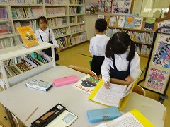 ↓ 週末読書 たくさんの児童が図書館で本を借りました。週末読書の秋を楽しんでください。国語の授業では、並行読書を進めています。例えば、4年の「ごんぎつね」では、登場人物の行動や気持ちの変化をとらえ、考えたことや感じたことを話し合う学習です。授業と並行して、ほかの物語で同じように読み比べていくことで登場人物の気持ちの変化を読む力がついていきます。