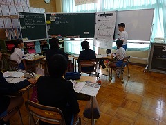 ↓ 複式ですから同時に5年生も同じ算数を学習しています。5年生は資料を読む学習です。①どの資料の、②どこから、③どう読んだからそう思ったか、根拠と理由が必要です。これをはっきりさせることで、あいまいな学習から、深い学習へ変化していきます。聞き取れなかった子はわからなかったことをちゃんと質問できる、すると、聞き取れた子が、「今、◎◎さんの言ったことは、~ということでした。」と、すかさず丁寧に言い換え、確認できる学習の土台がすばらしいです。教師に頼らず自分たちで解決しようと頑張っています。