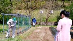 5月18日(木)の1・2年生苗植えに向け,畑の先生方(今年度代表の福田さんと,前年度代表の岩田さん)が準備においでました。もともと先生方は,「笠野園芸」の一員として来てくださっていたのですが,その団体としての支援がなくなっても,引き続き,「畑の先生」として本校に来てくださっていたのです。今年も,1・2年生への苗植え指導と,畑全体を囲むイノシシ等の動物対策ネット張りをお願いすることになりました。なお,苗植えの3日前(15日)に,そのための準備として,畝づくりをしていただくことになりました。何から何までとなりますが,よろしくお願いします。