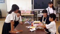 この日は,30度を超える暑さでした。毎週火曜日は,図書館司書の中田萌子先生が本校で勤務される日なのですが,本校の図書室には冷房がありません。これでは休み時間に本を読むどころではないということで,冷房のあるパソコン室に図書室の本棚を一架運び,休み時間,臨時図書室を開設しました。すると,冷房の魅力に誘われたのか,いつもはあまり図書室に来ない児童も多く訪れ,臨時図書室は大繁盛でした。中田先生は,切り絵(右写真)も用意してくださり,何人もの児童がチャレンジしていました。
