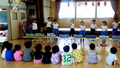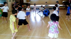 1・2年生8名が笠谷保育園に行き,3~5歳児11名(たけ組7名,きく組2名,ゆり組2名)と交流しました。特に,1年生の3人は,3月までこの保育園にいた関係で,園児も彼らも久しぶりの対面。とっても嬉しそうでした。はじめに,1・2年生の音楽発表を見てもらいました。「かえるのうた」の歌とハンドベル。「はじめの一歩」の手話・歌。「ドングリさんのおうち」の鍵盤ハーモニカ演奏。その後,転がしドッジボールをしました。とっても暑い日でしたが,児童たち,元気いっぱいでした。小川園長先生,担任の山田先生,ありがとうございました。