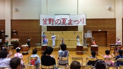 前日までは晴れていたのに,この日は雨模様。笠野の夏まつりは,昨年に引き続き,本校の体育館で行われました。17時30分に開会。まだまだ子供たちの出番には時間があります。外の縁日コーナーからは,おいしい香りが漂ってきています。時間も時間です。少し早い夕食をいただきました。第2部「伝統文化発表」は,18時50分に始まりました。はじめは笠谷保育園有志2名による「わらしっこ太鼓」でした。次が,笠野小学校有志8名による「笠野こどもデンデコ太鼓」。とっても迫力があり,圧倒されました。これまで指導してくださった七黒先生,祭笛を手伝ってくださった廣瀬さん,その他,お世話くださった皆様,ありがとうございました。