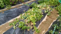 ※この日の夜,地元の方々にお聞きしたら,「ハクビシン」(か「狸」)だろうと教えていただきました。カゴで覆ってオモリを載せておかないとダメだろうとのこと。このあたりの方々は,イチゴやスイカはあまり作らないのだそうです。もちろん,動物に食べられてしまうからだそうでした。