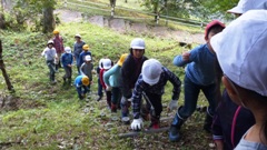 総合的な学習の時間に,笠野の森に行ってきました。学習の課題は,「春とのちがいを見つけよう」です。森に入る前から,空をとんでいるトンボを見て秋を感じ,森の中では,足下に広がるどんぐり,木の根本にあるコケ,赤く色づいた葉など,たくさんの秋を見つけ,春の森とは違う様子を楽しむことができました。授業の最後には,みんなで目を閉じ,森の音を聴きました。虫の声,鳥のさえずり,風に揺れる葉の音・・・。耳でも,秋の便りを感じることができました。(登美)