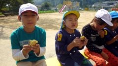 1・2年生が笠谷保育園に行き,3~5歳児と芋掘り体験交流をしました。保育園のさつまいもはとても大きく立派でした。その後,(先に作ってあった)石焼き芋をいただきました。本当の石焼きでした。最後に,いっしょにゲーム(おたまでのボール運び)をしました。