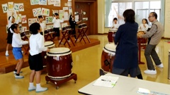 10月20日(金),学習発表会にむけ,1・2年生が,七黒先生のご指導の下,でんでこ太鼓の練習を始めました。1年生は初めてのでんでこ太鼓。少しずつ少しずつ上手になってきています。25日(水)には,担任の神村先生も,1年生のお手本として長胴(ながどう)太鼓をたたいて(右写真)くれました。本番が楽しみです。