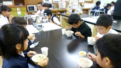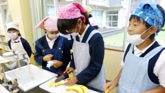 クラブ活動でおかし作りをしました。今回は,6年生のFさん,5年生のSさん,4年生のYさんが計画・準備してくれた「フルーツポンチ作り」でした。クラブ活動で調理を初めてする4年生は,ドキドキです。こわごわと包丁でバナナを切る姿は,とてもかわいらしかったです。5年生は,みんなと違う形に切ったりと,楽しんで作っている様子が見られました。そして,6年生はさすがです。食べたあとの後片付けまでしっかりとしていました。少し肌寒い日で,「アイスは冷たいかな?」と心配しましたが,みんなで作り,食べるフルーツポンチは格別だったようで,笑顔で「おいしい~!!」の声がたくさん聞こえてきました。(登美)