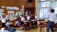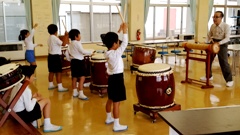 10月20日(金),学習発表会にむけ,1・2年生が,七黒先生のご指導の下,でんでこ太鼓の練習を始めました。1年生は初めてのでんでこ太鼓。少しずつ少しずつ上手になってきています。25日(水)には,担任の神村先生も,1年生のお手本として長胴(ながどう)太鼓をたたいて(右写真)くれました。本番が楽しみです。