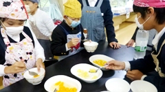 クラブ活動でおかし作りをしました。今回は,6年生のFさん,5年生のSさん,4年生のYさんが計画・準備してくれた「フルーツポンチ作り」でした。クラブ活動で調理を初めてする4年生は,ドキドキです。こわごわと包丁でバナナを切る姿は,とてもかわいらしかったです。5年生は,みんなと違う形に切ったりと,楽しんで作っている様子が見られました。そして,6年生はさすがです。食べたあとの後片付けまでしっかりとしていました。少し肌寒い日で,「アイスは冷たいかな?」と心配しましたが,みんなで作り,食べるフルーツポンチは格別だったようで,笑顔で「おいしい~!!」の声がたくさん聞こえてきました。(登美)