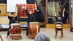 公民館にて「太鼓と昔遊びによる(世代間)交流会」が行われ,児童3名が参加しました。今年は,地元老人クラブの皆さんと,小規模多機能ホーム「愛の風」の皆さんとの,太鼓と昔遊びによる,総勢30名による交流会でした。児童たちは,七黒さんといっしょに今年度最後となる「でんでこ太鼓」を披露したり,地域の方々といっしょに「ドンパン節」を太鼓で演奏したりしました。途中,私も,ネクタイ姿のまま飛び入りで参加させていただきました。やったことがないのに,いきなり人前でというのは恥ずかしかったです。でも,それ以上に楽しかったです。(1年生のNさんに褒められて,さらに嬉しかったです。)その後,おいしいホットケーキをご馳走になったり,地域の方々とお手玉や達磨落とし,剣玉などを楽しんだりしました。