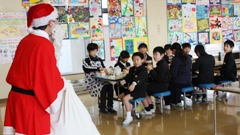 2学期最後の給食。この日の給食中,突然鈴の音が聞こえたかと思うと,本物のサンタクロースが現れました!(正体は校長先生だという噂がありますが,それは何かの間違いです。)本物のサンタクロースは,児童・職員全員に,とってもおいしい(公民館からいただいた)手作りのクリスマスマフィンをプレゼントしてくれました。ありがとうサンタクロース!来年もまた来てくださいね!!