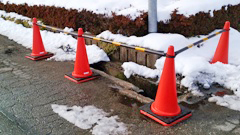 お知らせです。右写真のように,現在,校舎前の側溝の蓋(グレーチング蓋とコンクリート蓋)が一部なくなっています。そこで,コーンを置いてあります。2月3日の土曜授業参観においでる方は,お気をつけください。