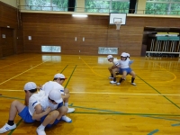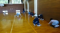 ↓ 5,6年生 体育 体ほぐし運動で柔軟性を高める運動です.3人でタイミングを合わせて立ち上がる運動です.H29新体力テストでは柔軟性が低かったので体育では継続して取り入れています.いろいろなバリエーションがあり楽しそうに運動していました.