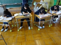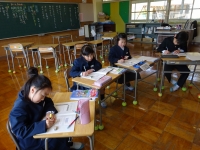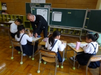 ↓1年生 算数プリントを頑張りました.よい姿勢で集中して名前を書いています.