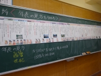 ↓5.6年社会 授業開きのオリエンテーションです.5円玉に5年生で習う学習がすべて入っていると教えていただき,改めて興味深く5円玉を観察しました.6年生は年表を見て歴史の世界に思いを馳せました.