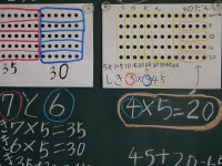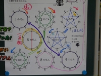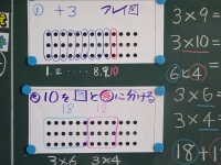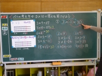 ↓3年生の算数の様子です.〈どんな決まりがあるのかな〉九九でそれぞれの段の1の位の数字をつなぐと,あら不思議,図形が出来上がりました.それぞれの段の数字と図形との関係を考えました.意欲満々,関係性を見つけて算数の世界のおもしろさに感動していました.