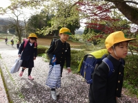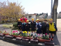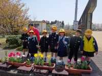 1年生は通学路をもう覚えたでしょうか.初めは教員が安全指導をしながら引率して下校をしています.もうしばらくしたら,自分達で下校することになりますのが,左右の確認をして飛び出しは絶対にしないでくださいね.チューリップの前でハイポーズ!