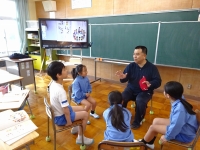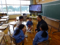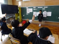 ↓2年 生活科 ICT活用をして,自分の思いを説明しています.資料を見て証拠を見せて,そして自分の考えを伝える,このような活動は大人になって社会に出てからも大事な力となります.「自分の考えを根拠を示し,堂々と話せる人になってほしい」と願い,普段の授業から意識して育てています.