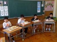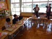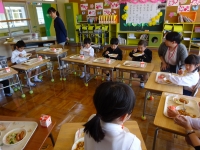 1年生の初めての給食 2年生が準備や後片付けの仕方を丁寧に教えてくれました.誰も残さずカレーライス,サラダ,ウインナーにデザートおいしくいただくことが出来ました.