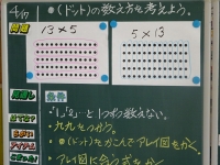 ↓ 3年生の算数です.粘り強くかけ算の求め方を説明し合っていました.いろいろな見方により,考える力が鍛えられ,数字の楽しさや面白さ,素晴らしさを感じる子を育てたいと思います.13×5の積を求めるために13を6と7に分けて,6×5と7×5を計算してその後,たしていました.13を4と9に分ける方法もありました.