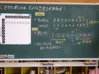 ↓3年生の算数の様子です.〈どんな決まりがあるのかな〉九九でそれぞれの段の1の位の数字をつなぐと,あら不思議,図形が出来上がりました.それぞれの段の数字と図形との関係を考えました.意欲満々,関係性を見つけて算数の世界のおもしろさに感動していました.