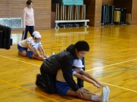 ↓ 5,6年生 体育 体ほぐし運動で柔軟性を高める運動です.3人でタイミングを合わせて立ち上がる運動です.H29新体力テストでは柔軟性が低かったので体育では継続して取り入れています.いろいろなバリエーションがあり楽しそうに運動していました.