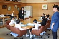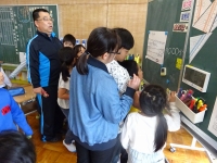 ↓1年生が学校探検 校長室を探検に来ました.校長室は「おまじない」のおへやでもあります.「めんどくさくい」「怒りたい」「悲しい」「人見知りする」・・・など困ったことがあったら「頑張る勇気」「元気になる」,そして,「優しくなる」おまじないをかけてあげますので,いつでもきてください.すぐに笑顔になるとびっきりの「おまじない」を教えてあげますよ.1年生は自分から質問もたくさんできました.よい質問ばかりでした.興味を持つことが学習の第1歩,何かな?どうしてかな?と疑問を持って学習してくださいね.