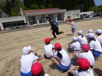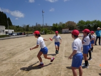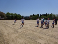 ↓5.6年体育 リレーのタイムを計りました.「あと3秒は縮められる」と担任の先生からのお話があり,縮めるためにまずバトンパスを工夫することになりました.チームで練習の仕方を話し合い,即練習開始です.