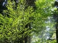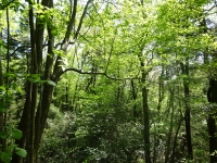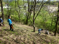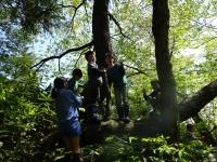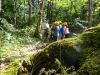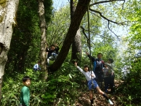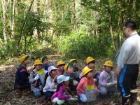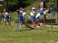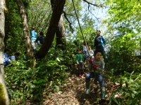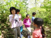 ↓3.4年生は総合で「春の自然」体験に「笠野の森」へ入りました.鳥のさえずりは「ホーホケキョ」,「ケーン,ケーン」と森に響き,ブナの新緑に木漏れ日が当たり,自然を満喫できました.森にはなんとターザンロープがあり,春の風をきって楽しんでいました.国語の「きつつきの商売」の森を想像できました.