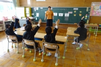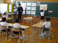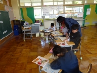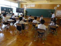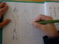 ↓1年 国語 あいうえおの口の形をしっかり作って「あいうえお」の歌を歌ってくれました.将来,アナウンサーや司会者にばっちりなれそうなはっきりとした発音でした.そのあとは,鉛筆の持ち方,姿勢を確認して,正しい書き順で「あいうえお」を書きました.