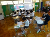 1年生,算数では,まっすぐに並べると数えやすいことを話し合いました.この考え方は,グラフにつながる大切な思考です.入学してまだ2週間ですが,「付け足します」「質問があります」等,話し合いのルールが身についてきました.