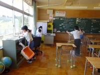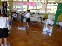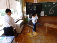↓1年生初めての掃除 上級生が優しく教えてくれたので,1年生は掃除の仕方が分かり一生懸命頑張りました.黙って静かに掃除をして,教室も廊下も,心の中もピカピカに磨かれています.