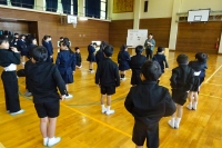 ↓ 給食室からの出火想定で避難訓練を実施しました.今日は小雨でしたので,一旦ベランダから外へ避難し,振り返りは体育館で行いました.体育館までの避難時間は2分19秒,合言葉の「おかしも」(おさない,駆けない,しゃべらない,もどらない)は守られ,集まってからの姿勢もよく,第1回目の避難訓練ですが,これまでの積み重ねを感じました.有害な煙を吸わないために,ハンカチで口と鼻を押さえて避難します.いつも清潔なハンカチを身につけていましょう.命を守るハンカチです.