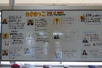 ↓ 先生方からの子ども達へ温かいメッセ-ジを玄関前に書いています.「学び方を学ぼう」,身だしなみが整い「制服の着こなしが素敵です」,「探鳥会楽しみですね」,「器械運動怪我しないよう気を付けてね」,「あなたのあいさつ最高です」,「横断歩道,止まってくださった車の運転手さんに並んで挨拶,素敵です」等,全職員で全児童の一人一人のよさを見つけています.